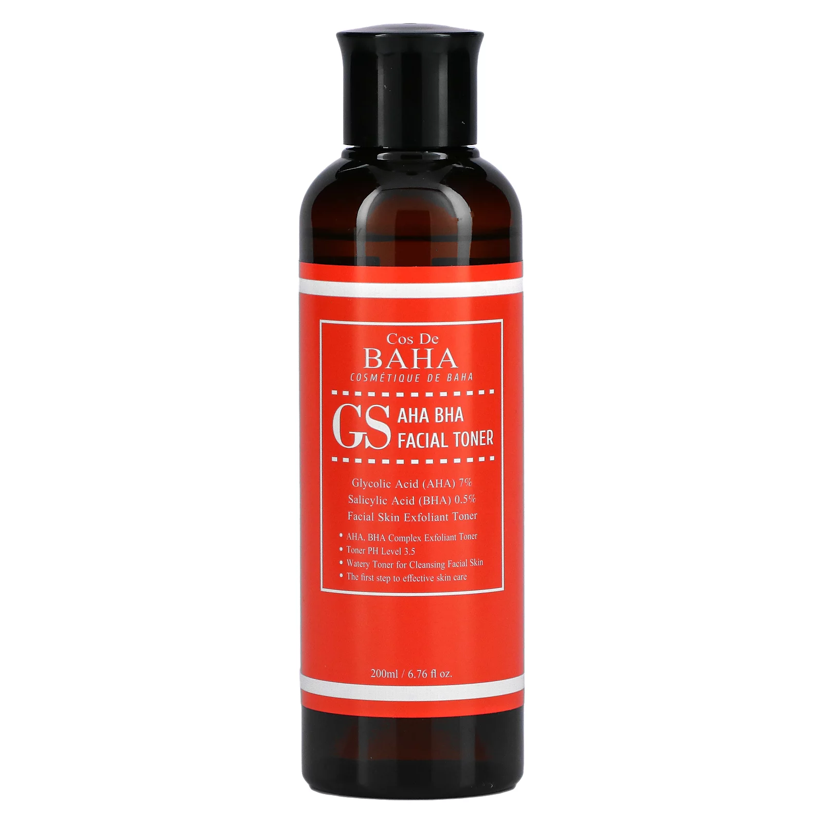 Glycolic Acid (AHA) 7% ​Salicylic Acid (BHA) 0.5% Facial Skin Exfoliant Toner AHA, BHA Complex Exfoliant Toner Toner PH Level 3.5 Watery Toner for Cleansing Facial Skin The First Step to Effective Skin Care Not Tested on Animals Cos De BAHA GS Facial Toner contains Glycolic Acid (AHA) 7%, Salicylic Acid (BHA) 0.5%, Niacinamide (Vitamin B3) and Natural Herb Extracts as active ingredients. Cos De BAHA produces the cosmetic products in facilities certified by the Korea KFDA. Cos De BAHA products are created from the effective ingredients, formulated according to scientific research that determines the precise blend of the most effective scientific ingredients. We will always try to make products that are safe and effective on the skin.