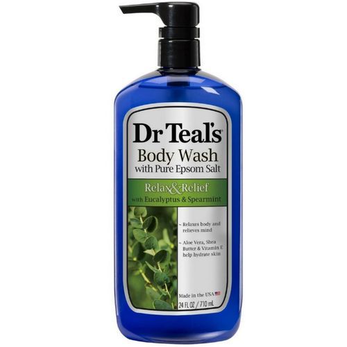 Dr. Teal’s Epsom Body Wash with Eucalyptus Spearmint. Dr. Teal’s is famous for its epsom salt soaks, but their body washes are just as powerful and effective. Dr. Teal’s Relax and Relief body wash is packed with epsom salt to relieve tired, achy muscles. plus aloe vera, shea butter and vitamin E to heal, condition and moisturize dry skin. Spearmint is added as a restorative for the body, plus eucalyptus to refresh and stimulate the senses. Each 24 oz bottle of Dr. Teal’s eucalyptus spearmint body wash is outfitted with a pump dispenser for effortless use.