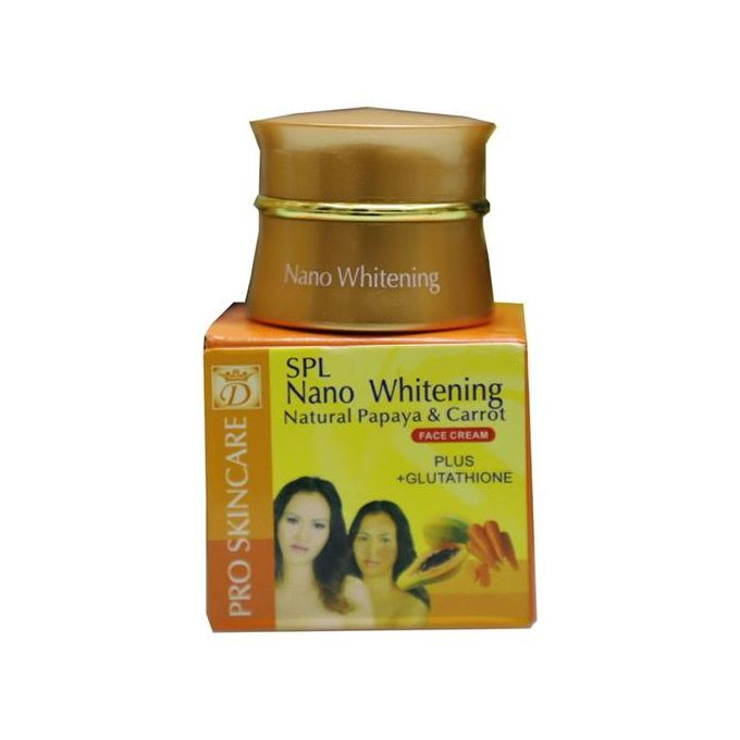 Nano Extra whitenin.g face cream Contains vitamin A and C,papaya and carrot derivatives, to help reduce oil, acne, melasma and freckles on your face and shedding cellls to whiten your skin. Enzyme from papaya fruit helps remove deteriorated skin cells resulting your skin to be brightly whiten, gentle and refreshed. Compensates and reconditions your face skin from being darken and having melasma and unparallel color to be brightly whiten. Leaves you feeling refreshed all day. It can be used with all skin condition. Nano Extra whitenin.g face cream Contains vitamin A and C, papaya and carrot derivatives, to help reduce oil, acne, melasma and freckles on your face and shedding cellls to whiten your skin. Enzyme from papaya fruit helps remove deteriorated skin cells resulting your skin to be brightly whiten, gentle and refreshed. Compensates and reconditions your face skin from being darken and having melasma and unparallel color to be brightly whiten. Leaves you feeling refreshed all day. It can be used with all skin condition.