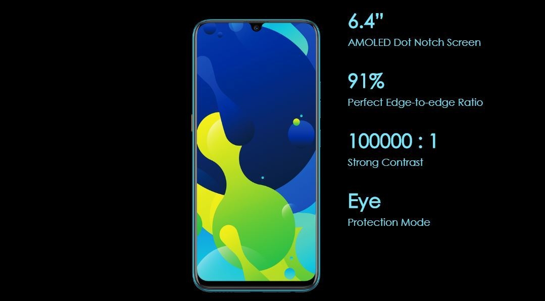 - Display: 6.4 inches, 720 x 1548 pixels, 19:9 aspect ratio, AMOLED screen, with a waterdrop notch.