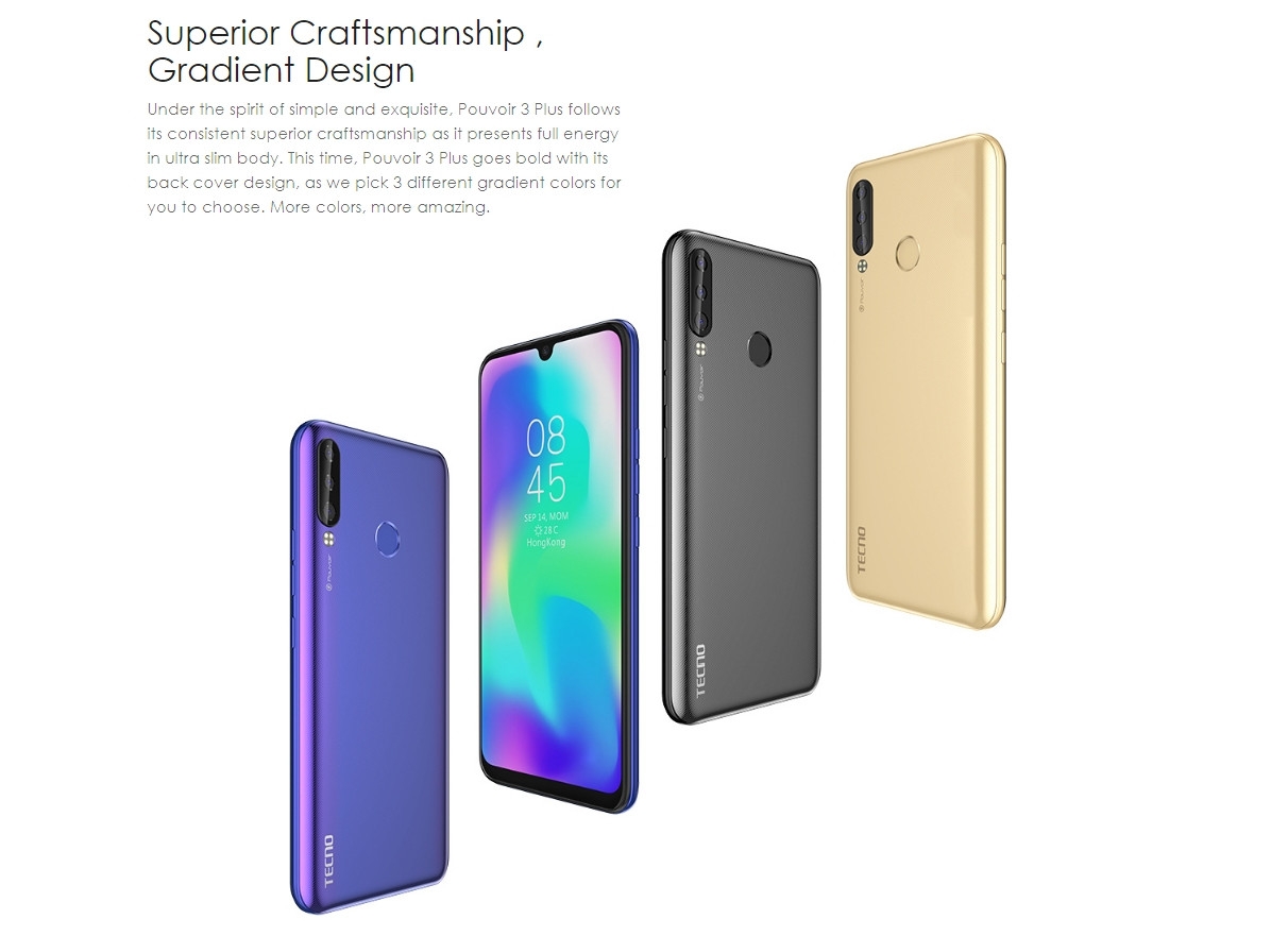 Tecno Pouvoir 3 Plus Air (LB8a) 6.35″ AMOLED (64GB ROM+ 4GB RAM) Android 9, (13MP + 8MP + 2MP)+8MP 6000mAh 4G LTE – Champagne Gold